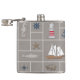 Ilustração temática náutica com cavalo marinho, barco à vela, roda à vela, âncora, farol, peixe, concha, estilhaço e condecoração de bússolas em retângulos sobre fundo arenoso de grunge