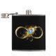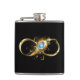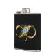 Símbolo dourado e brilhante de infinito, decorado com pena de pavão com turquesa em fundo preto.
