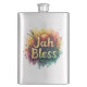 Carry your spirit and your favorite drink in style with this classic stainless steel flask featuring the vibrant “Jah Bless” design. The bold, cursive text fades from yellow to green, surrounded by colorful watercolor splashes in red, orange, yellow, green, and blue, along with leafy accents, musical notes, and a radiant sunburst. Durable and compact, this flask is perfect for festivals, adventures, or simply expressing your love for reggae culture and spiritual energy wherever you go.