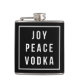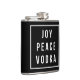 Ah, os feriados! Joy, paz...e vodka. Um frasco engraçado faz um presente de excelente para o amante do coquetel em sua vida. Design apresenta um fundo preto com "Joy Peace Vodka" em dentro de um contorno quadrado branco.