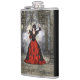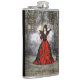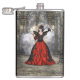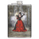 Renderização digital em 3D de um belo feiticeiro feminino em um vestido vermelho e preto com asas em um fundo de castelo fantasticamente assustador