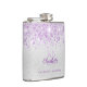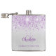 Um fundo com aparência prateada falsa e brilho violeta falso. Personalize e adicione seu primeiro nome, iniciais do monograma e nome completo. O primeiro nome é escrito em roxo com uma fonte manuscrita moderna.