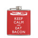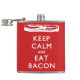 Mantenha calmo e coma o bacon. O bacon acalmá-lo-á, amá-lo-á e mantê-lo-á…. bem, VOCÊ! Devore o bacon delicioso e auto-actualize-o. Baseado no poster da segunda guerra mundial, "MANTENHA A CALMA E CONTINUE". Texto e imagem brancos sobre um fundo vermelho.