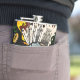 Arte vetorial original de uma mão segurando cartas de jogar que estão em chamas. Com moedas de ouro, dados, 8 Bola, Fita e rosa.