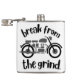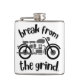 Um frasco apresentando uma motocicleta retrô monocromática, com a frase "Quebre a rotina" centrada em torno da imagem. O design sugere um senso de aventura e liberdade, oferecendo uma fuga pacífica da rotina diária.