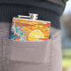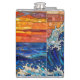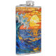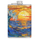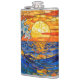 A flask with an illustration of a stained glass mosaic ocean waves and sunset illustration.