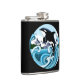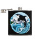 Uma orca pulando do oceano com água por toda parte. Montanhas e céu azul ao redor da baleia assassina desenhadas num estilo de tatuagem art nouveau.