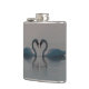 Foto incrível de dois cisnes nadando cabeça a cabeça criando a ilusão de um coração na água. Eles estão juntos num lago neblina de manhã cedo,