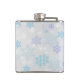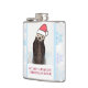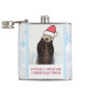 Flask com texto: uma alegria fantástica de natal. O texto pode ser alterado. Uma fotografia natural de uma lontra fofa que se levanta na água com as patas debaixo do rosto. Vestindo um chapéu de natal vermelho desenhado à mão. O fundo é um padrão de floco de neve.