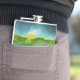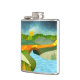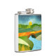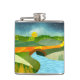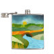 Cena de abstrato de um rio que passa por uma ponte de pedra com colinas rolantes e uma estrada de ouro em cores e texturas ousadas.