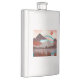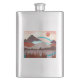 Paisagem de montanha em vermelho e azul com um lago e um arco-íris azul arrojado.