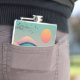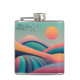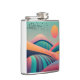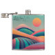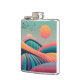 Uma paisagem abstrato de colinas rolantes em cores vibrantes brilhantes com texturas arrojadas e um bando de aves no céu.