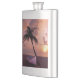 Matizes suaves de pinks e céu alaranjado com barco de pesca de madeira sob uma palmeira.