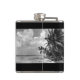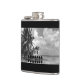 Fotografia branca e preta vindimada de uma praia tropical com palmeiras a esticar-se sobre o mar.
