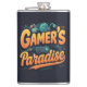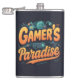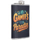 Um design gráfico vibrante e nostálgico que apresenta o texto "Paraíso dos Jogadores" em uma fonte divertida e pixelizada que lembra videos games clássicos. O design incorpora elementos de aventura e exploração, com uma paleta de cores que evoca sentimentos de entusiasmo e nostalgia. A composição geral é dinâmica e convidativa, apelando aos jogadores de todas as idades.
