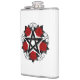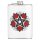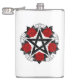 Pentagrama preto com padrão, decorado com floração, rosas vermelhas com folhas em fundo branco. Tatuagem.