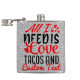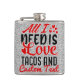 Personalizado Tudo o que Preciso é Amor Tacos e TEXTO ou Nome Personalizado. Fundo Brilhante Prateado Falso. Faz um presente único para o Dia dos Namorados ou QUALQUER DIA! Personalize com seu hobby favorito, ocupação ou coisa especial em sua vida. Você ama Cavalos, Hot Rods, Motocicletas, Pesca, Caça, Carros Clássicos, Tricô, Costura, Whisky, Vinho, Futebol, Golfe, Esportes? Qualquer coisa funciona!
