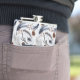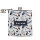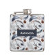 Um frasco com um belo padrão. Pinhas, penas, agulhas de pinho e bagas. Design de aquarela russa. Nome personalizado dentro um quadro azul escuro colocado sobre o topo.