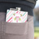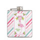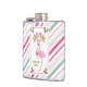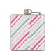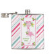 Um frasco de natal tropical baleado. Um flamingo rosa rico com uma perna erguida. Vestindo um chapéu de santa rosa e um pouco de holly sazonal. Holly com bagas também enfeita os cantos. Um buquê floral com canetas doces acima da cabeça. Um fundo listrado de canas cor-de-rosa e verde.