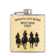 Brinde ao grande adeus do noivo! Adicione o nome do padrinho. Este cantil de despedida de solteiro apresenta quatro silhuetas de cowboy avançando contra um ousado pôr do sol ocidental com listras coloridas, junto com a frase "O Último Rodeio do Noivo". Perfeito para manter a celebração animada durante os bares, aventuras ao ar livre ou festas temáticas country em Nashville, Austin, Las Vegas ou mesmo em casa. Uma lembrança divertida e funcional para a noite inesquecível do noivo.