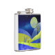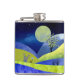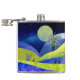 Uma paisagem de abstrato que representa colinas rolantes com primavera e plantas florescentes e uma lua e estrelas em tons de azul, ciano, amarelo e rosa.