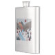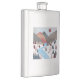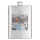 Uma bela paisagem com texturas únicas mostrando um rio e uma paisagem de montanha com uma raposa em caça de salto médio na neve em tons de vermelho, verde, azul e bege.