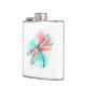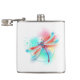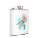 Red, flying, artistically drawn, in bright colors with textured iridescent, blue wings on white background, painted over with splashes of watercolor paint. Bright red dragonfly.