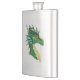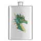 Um perfil lateral de um dragão verde esmeraldo num pano de fundo da casa da moeda