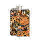 This Halloween pattern has a vintage, retro-inspired theme. The design features a collage of classic Halloween elements in vibrant orange, black, and gold tones. Key imagery includes a sleek black cat with a mischievous expression, grinning jack-o'-lanterns, and elegant witches in flowing gowns.