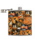 There are also haunted houses, spooky ghosts saying "Boo!", dancing skeletons, and autumnal flowers, all enhanced with glittering gold accents. The background alternates between dark, starry skies and bright orange fields, creating a festive and slightly eerie atmosphere. This pattern evokes a playful and nostalgic Halloween spirit, perfect for wrapping gifts or decorating for the holiday.