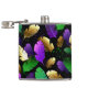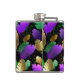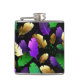 Seamless pattern of bright purple, green, and gold feathers on black Mardi Gras background. Design for the Mardi Gras holiday.