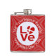 O AMOR dinamarquês FLAG num frasco de anca. Aqui, a palavra LOVE aparece em letras vermelhas dentro um círculo branco e fractal de quadrados pretos; o círculo se senta sobre um fundo fractal vermelho também usando quadrados pretos. presente divertido para ele no Dia de os namorados ou em qualquer momento especial.