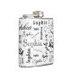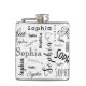 Um frasco de nome personalizado para a bebida favorita de Sophia. A escrita inicial "S" faz um padrão decorativo no fundo. Seu nome apresenta uma mistura de letras divertidas e cores contrastantes marcantes de preto, branco e cinza. Esta personalização faz uma escolha de presente excelente para qualquer ocasião que exija altas almas.