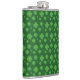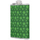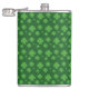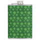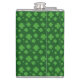 Trevos de quatro folhas verdes sortudos em um frasco de fundo verde.