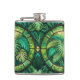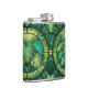 Two metal flasks with vibrant green tropical leaf designs over a geometric pattern. The tone is lush and lively, evoking a sense of nature.