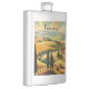 poster de viagens vintage do campo na Toscana Itália com árvores ciprestes, colinas de ouro rolante e casas remotas