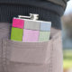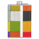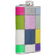 A metallic flask with a vibrant geometric grid design of twelve colorful squares. Featuring shades of pink, blue, green, yellow, purple, and gray, this modern flask combines practicality with artistic flair. Perfect for carrying drinks stylishly while adding a creative touch to everyday essentials.