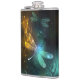 Voo de libélula brilhante, verde, desenhada artisticamente, com asas verdes e amarelas transparentes sobre fundo noturno brilhante com plantas pântanas e vagalumes. Dragonfly brilhante.