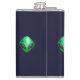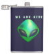 Cool fun hip flask with a printed image of 3/three green alien heads on a very dark blue background, with a caption/phrase which reads "WE ARE HERE"