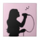 Vetor maravilhoso de uma garota de cabelos longos com um microfone cantando.