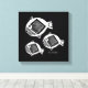 Desenho de tinta de três peixes estilizados. TINTA BRANCA EM CANVAS REVESTIDAS OU ESCURAS. Inspirado pela antiga design de cerâmica e arte rupestre, desenhei estes peixes não realisticamente, mas interpretativamente. Por Tradutor.