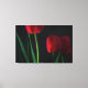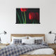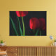 A arte da canvas é mostrada com uma impressão fotográfica de lindas tulipas vermelhas com gotas d'água. Imagem do stock vecteezy.com