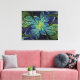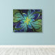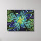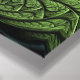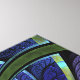 Folhas de vidro manchadas, de cor verde e turquesa, apresentam uma flor central em tons de azul e roxo.