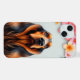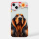 Retrato lindamente detalhado de um cão, provavelmente uma ilustração de uma raça de sabujo, posicionado centralmente contra um fundo claro. Seu pelo é longo e fluído, predominantemente em tons de marrom e preto. Ao redor do cão há um arranjo floral vibrante, composto por várias flores em tons suaves de rosa, amarelo e branco, juntamente com folhas verdes. As flores criam uma moldura alegre e colorida em torno do cão, realçando a estética geral da imagem. A composição tem um sentimento caprichoso e artístico, transmitindo uma sensação de calor e afeto.