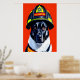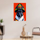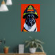 Retrato de um lindo e adorável cão de bombeiro preto e branco num fundo vermelho. Esta é uma arte gerada por IA.