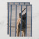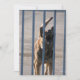 Guarda latindo atrás de bares de ferro azuis. Fotografia