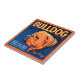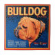 Um impressão de etiqueta de caixa de safra ilustrando um buldogue com um fundo azul padronizado e uma borda laranja. Escolha este impressão de arte no seu produto Zazzle hoje mesmo.