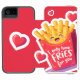 A cute and colorful cartoon illustration of a red French fries carton with a happy kawaii smiling face. The design features a floating red heart and the romantic funny pun quote "I only have FRIES for you". The image has a white sticker border, making it perfect for Valentine's Day greeting cards, fast food lovers, and humorous romantic gifts. Isolated design.
