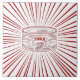 Uma ilustração retrógrada do estilo poster da publicidade de uma lata de atum cercada por uma explosão de sol de vermelho.