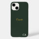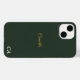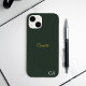 Uma capa de telefone na moda em cores Douradas e verdes florestais com um nome e letras monogramas em branco. Uma boa ideia de presente para uma mulher elegante e elegante. Também, adequado para homens quentes e distintos.